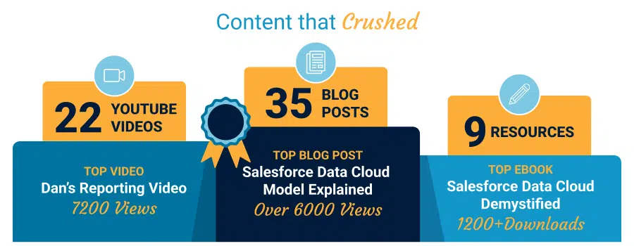 Salesforce MVP Eliot Harper continued to be golden with his eBook on Salesforce Data Cloud raking in over 1200 downloads – our strongest performing asset ever, and his blog post on Salesforce Data Cloud Model explained amassing over 6000 views. (Honourable mention goes to Sab’s “Free Pardot Email Templates” which was visited over 2500 times.) On the video side of the house, Partner Dan Stratton’s How to Calculate Conversion Rates in Salesforce Reports video had over 7200 views in 2023 (and it was actually released last year), so we’re glad that people are continuing to get value out of that!